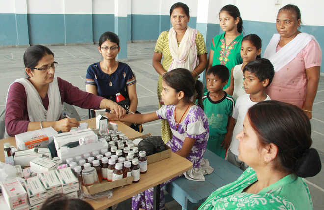 Medical Camp A medical team of the health department checks patients at Gandhi Camp in Jalandhar on Thursday. Tribune Photo: Sarabjit Singh, with Rachna Story